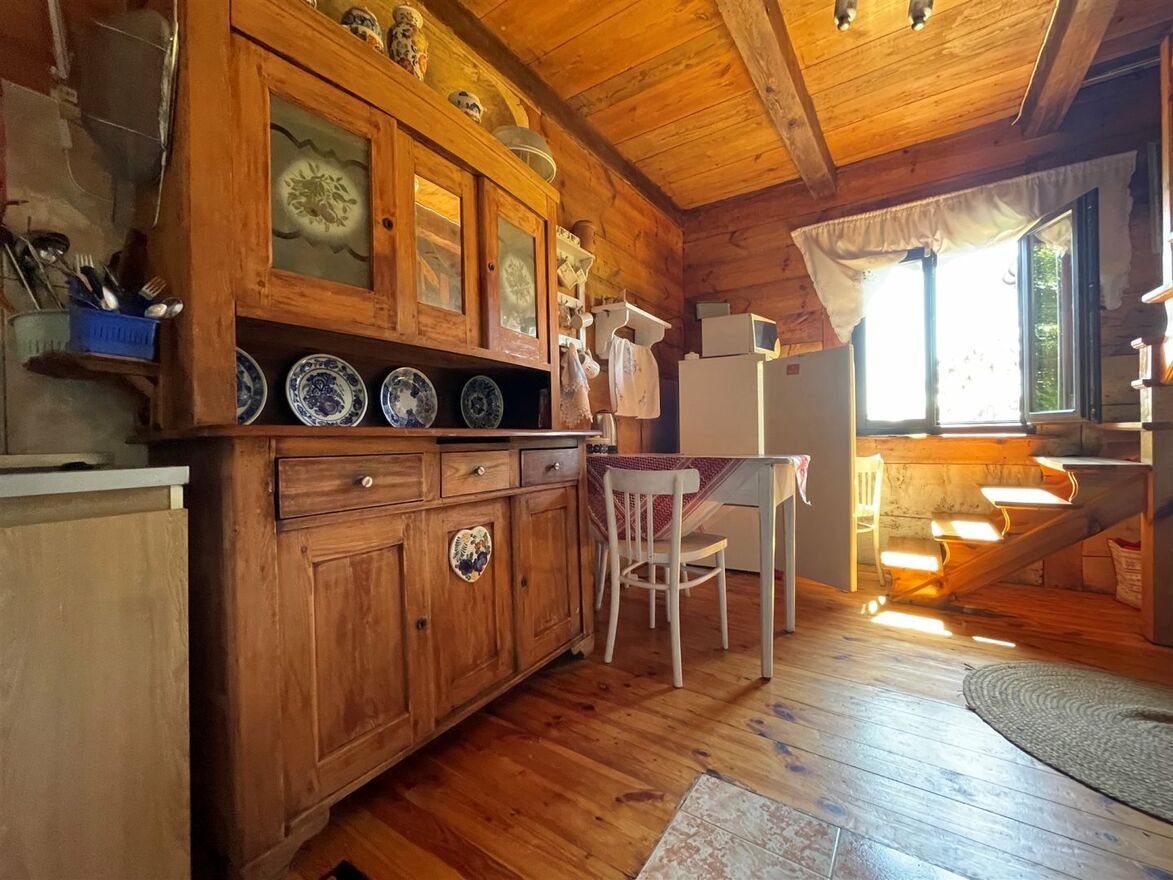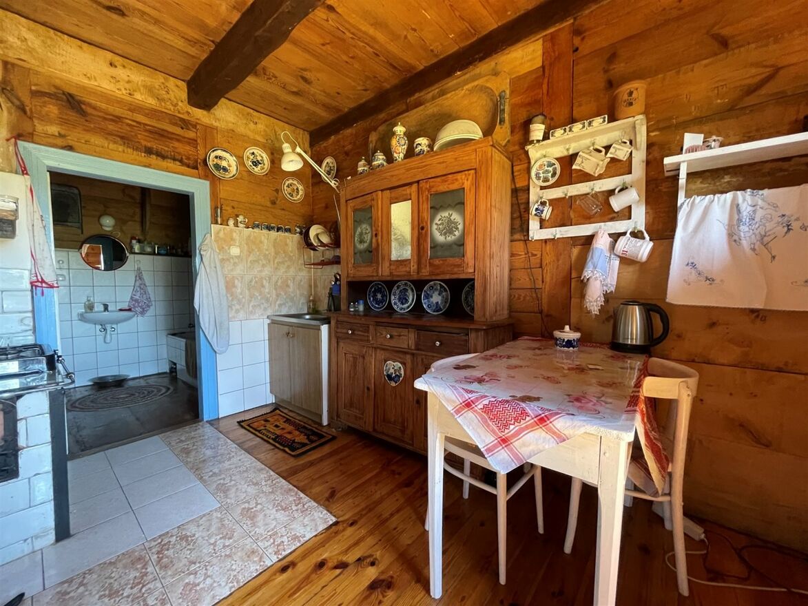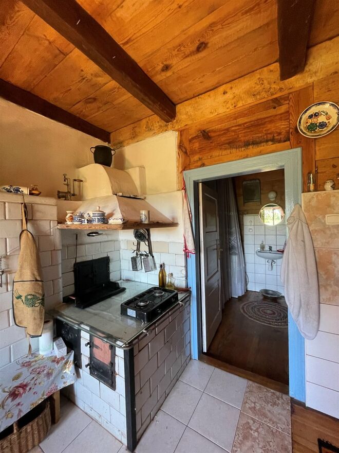 - kuchnia z dobrze zachowaną kuchnią kaflową, z kuchni prowadzą drewniane schody na poddasze